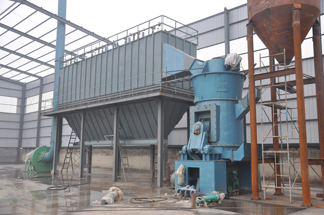 电动机通过减速机带动磨盘转动,同时热风从进风口进入磨内,物料从下料口落在磨盘中央,由于离心力的作用,物料向磨盘边缘移动,经过磨盘上的环形槽时,受到磨辊的碾压而粉碎,继续向磨盘边缘移动,直到被风环处的气流带起,大颗粒的物料直接落回到磨盘上重新粉磨。气流中的物料经过分离器时,在导向叶片和转子的作用下,粗料从锥斗落到磨盘上,细粉随气流一起出磨,在系统的收尘装置中收集,即为产品。物料在与气体接触过程中被烘干,达到所要求的产品水份,通过调节导风叶片的角度和分离器转子转速,便可得到不同细度的产品 .